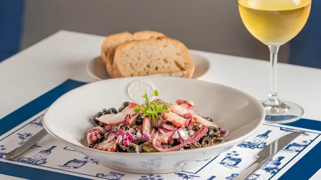 - Polvo macio misturado com cebola roxa, azeitonas pretas, alcaparras e ervas frescas, temperado com azeite de oliva extravirgem. Servido com pão de fermentação natural quente