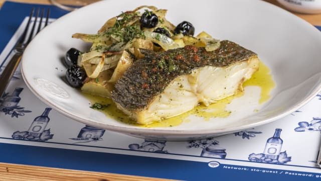 - Lombo alto de bacalhau (gadus morhua) de primeira qualidade, assado com batatas, cebolas, azeitonas pretas e azeite extra virgem