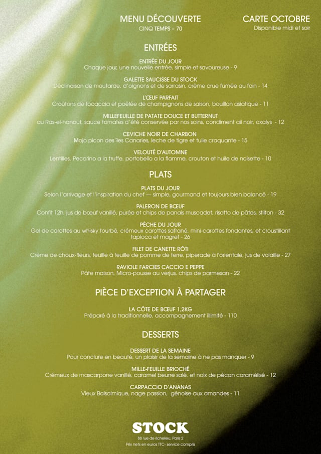 Monsieur, Je réponds à votre message afin de préciser aux lecteurs que votre avis a été rédigé dans l’intention de nuire à l’image de notre restaurant. La raison de votre frustration ? Vous n’avez pas bénéficié de la réduction The Fork de 30 %, réservée aux réservations entre 19 h et 20 h, car la vôtre était à 20 h 30. Mécontent, vous avez réglé votre addition avec amertume et demandé un geste commercial, ce que j’ai refusé. Vous avez pourtant décrit votre repas comme « très bon » et « parfait » avant de laisser un avis contraire. Concernant les prix, ils sont affichés sur The Fork, notre site, la carte extérieure et nos menus. Votre addition de 110 € pour deux inclut cocktails, entrée, plat à partager et dessert, sans frais cachés. Vous avez choisi de consommer ces plats en toute connaissance de cause. Votre commentaire est trompeur et regrettable. Nous acceptons les avis constructifs, à condition qu’ils soient sincères et de bonne foi. Cordialement, Ludovic Senejoux et toute l'équipe du Stock.