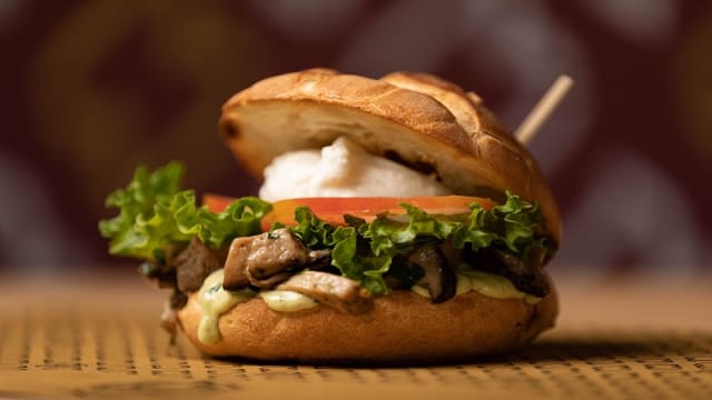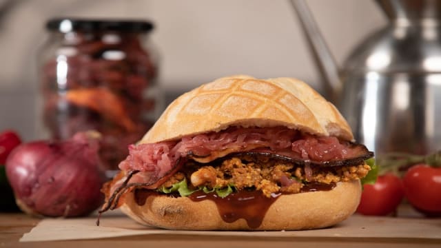 400 G di hamburger di scottona affumicato a freddo (CBT 2h, 58°), bacon croccante, doppio cheddar, porro (CBT 1h 30m, 85°), salsa BBQ stocotto, insalata riccia