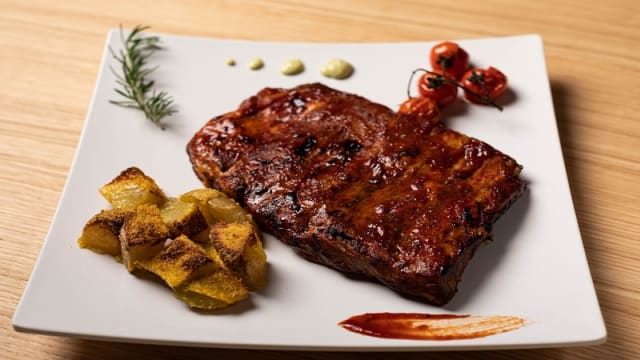 Controfiletto di angus argentino frollato per 50 giorni (CBT 7h 30m, 58°) con rub e salsa BBQ Stocotto homemade, affumicato a vista con sentori di cedro e quercia Il prezzo è calcolato in funzione del peso (8,00 €/100 g)