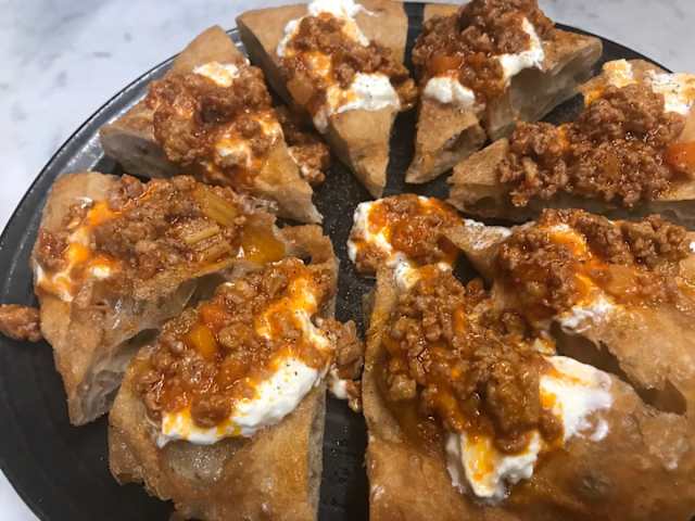 - Impasto padellino alla vellutata di cipolla di tropea con carpaccio di tonno fumè, bufala affumicata, cipolla essiccata