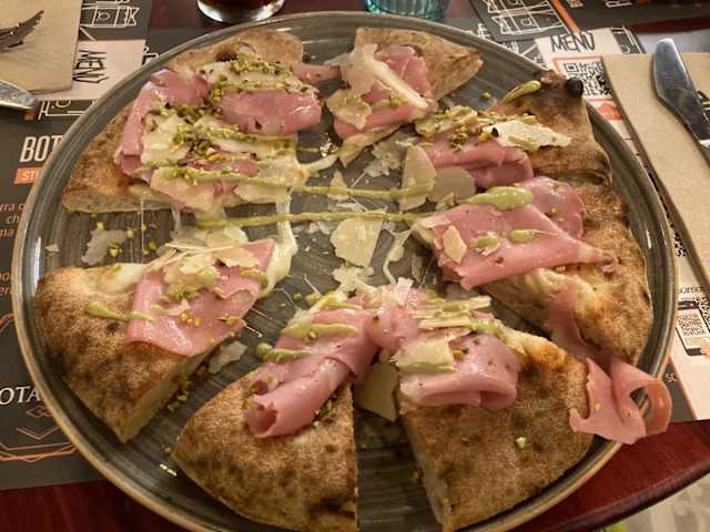 - Pomodoro san marzano, mozzarella fiordilatte, salame piccante, prosciutto cotto alla brace, gorgonzola dolce e peperoncino