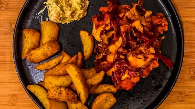Pollo in panatura croccante e speziata, mostarda al miele, coleslaw, doppio cheddar e doppio bacon affumicato