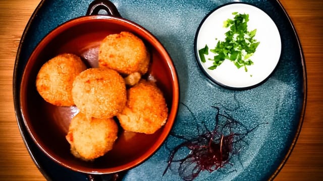 Polpettine di spalla di maiale cotta a bassa temperatura e sfilacciata accompagnate da una crema di formaggio alla menta