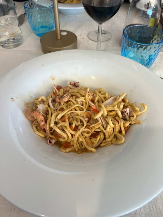 Tagliolini fatti in casa con scampi o gamberi, calamari e pomodorini