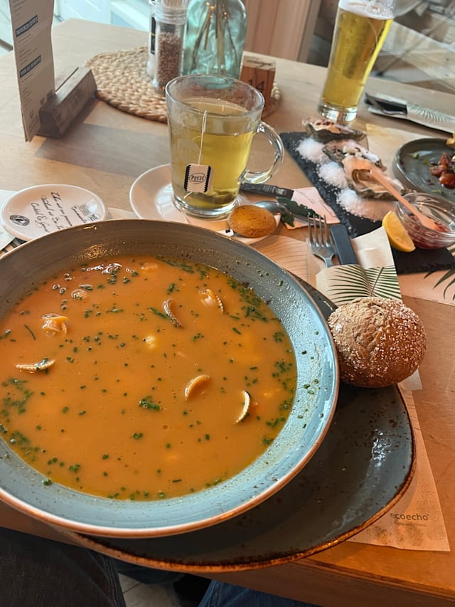 9/10Food was great, as well as the ambience, with our table facing the window with a memorable view on the sunset. Service was slow. It took 20 minutes to take the order after the menu was offered. Additionally, we asked for tap water in the middle of the meal. They brought us a bottle of water. OK, no problem, even though we asked for something else. Then, we surprisingly discovered from the receipt that 0,750 ml (!) of water costs more than 8 euro (!!!!). Next time I would suggest to advice the customers of this outrageous price.
