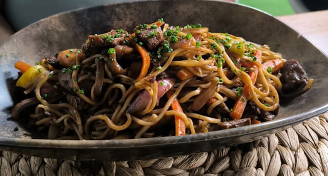Salteado oriental de solomillo, cebollita, berenjenas, calabacín y soja
