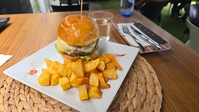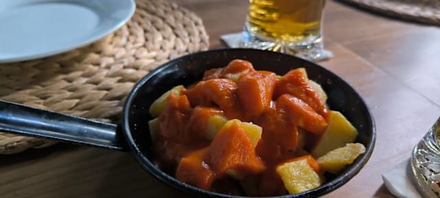 Con papas fritas y chorizo asturiano o jamón ibérico