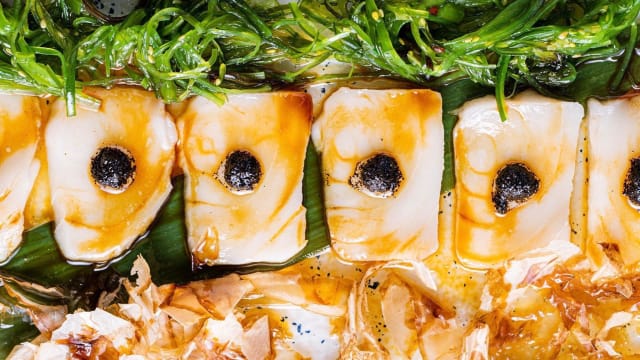 Sobre cama de brotes verdes y frutos secos aliñada con savia de palma