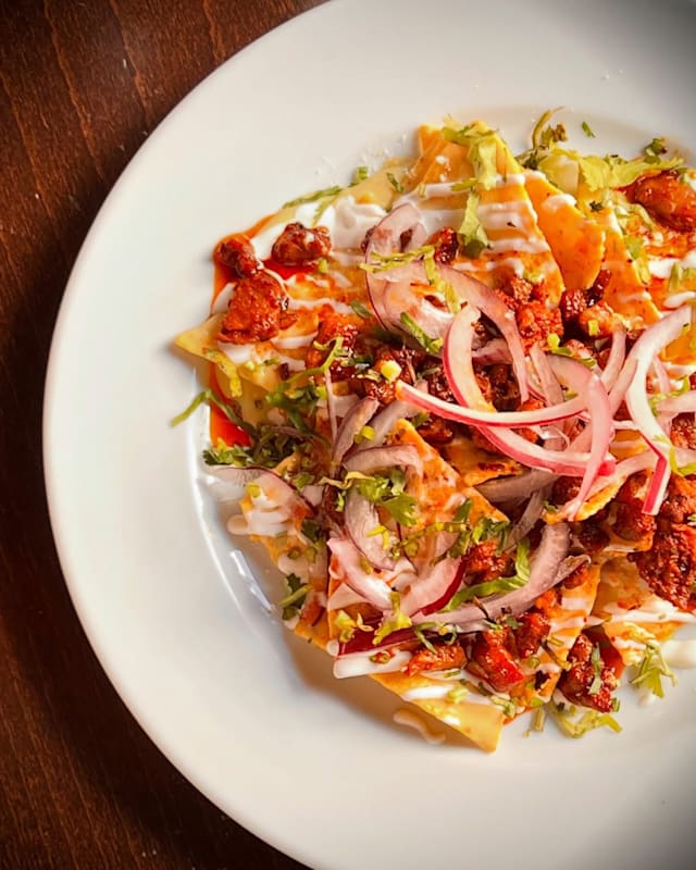 Totopos 100% de maíz bañados con nuestra deliciosa tinga de pollo,tomate, cilantro, cebolla y nata ligeramente picantes..