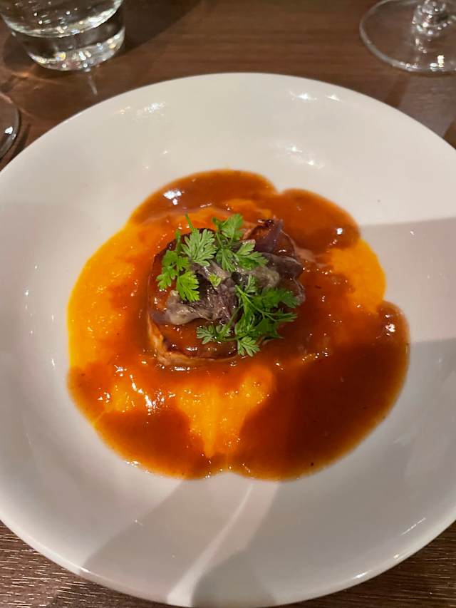 - Magret de canard, confit d'oignons au vin rouge, navets et carottes aux agrumes