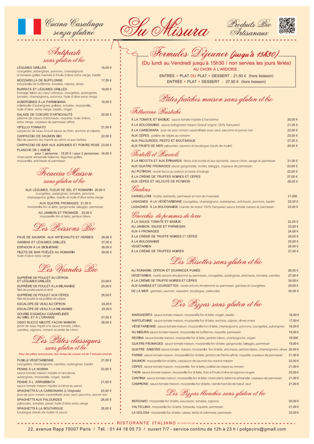 Signor Fovargue Grazie delle scelte del nostro ristorante italiano al 100% Senza Glutine nel quartiere della Torre Eiffel Tutta la squadra del SU MISURA vi ringrazia per la vostra gentilezza e per la vostra recensione talmente importante per noi grazie a voi Le auguriamo un buon soggiorno a Parigi e ancora una volta, grazie di cuore