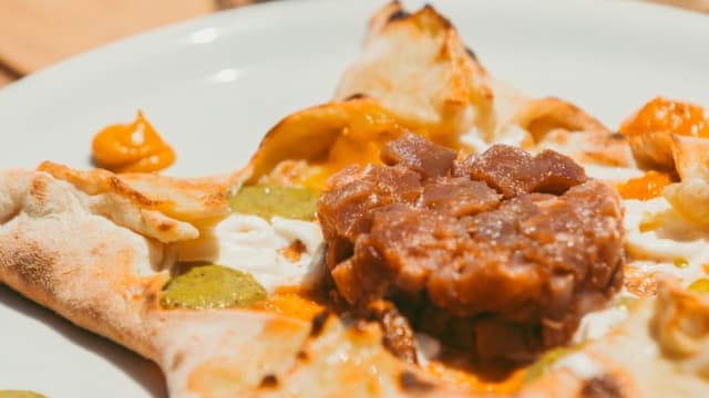 - Fior di latte, speck, crema di noci al gorgonzola, stracciatella, granella di noc*