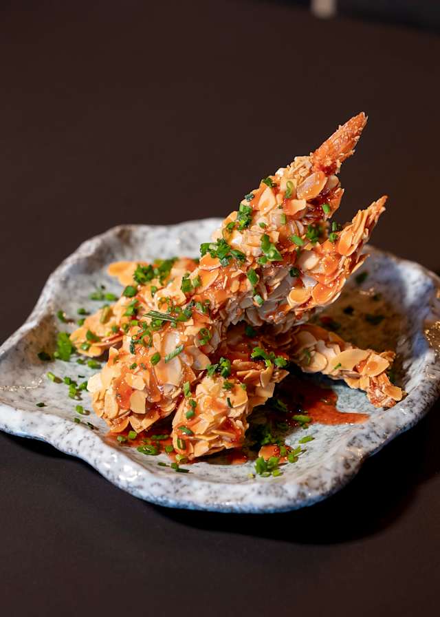 - Gamba selvagem de moçambique tempura com amêndoa laminada e cebolinho