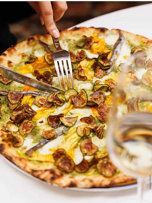 Crema di zucchine, fior di latte il casolare, zucchine alla scapece, fiori di zucca, alici di cetara, zest di limone e olio EVO marchese di canossa