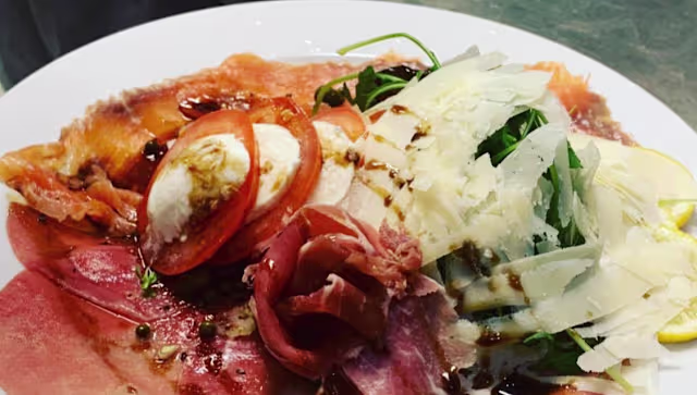 - Misto de mozzarella caprese, carpacio de carne de salmão, presunto de parma, beringela em vinagre balsâmico, pimenta verde, alcaparra, aipo, manjericão, limão e pimenta moida