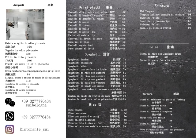 9.5/10We have been in Bologna for 3 weeks. We have been to 3 Chinese food restaurants so far and think “Sui” is the best. We have dined there 2x. One of us is Chinese, and we both live in China, so we have pretty strong opinions as to what is authentic Chinese food. We think the food at “Sui”, a Sichuan-style Chinese food restaurant, is great. Very tasty and the food looks really authentic too. The Gong bao ji ding dish (often rendered as Kung Pao Chicken in the U.S.) is top level. “Sui”’s Gan Guo dry pot (eg with shrimp, intestine, bull frog, chicken) is also great. Seems always very full there at dinner time so I recommend booking ahead.