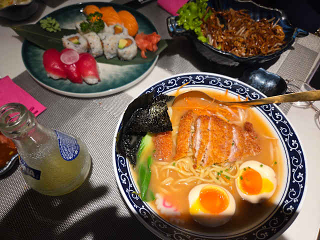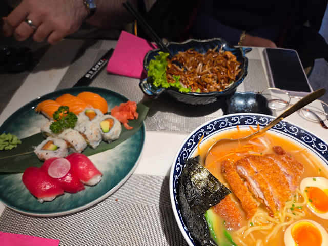 - 3 nems poulet, 8 california saumon avocat, 2 sushi saumon et un petit katsu don