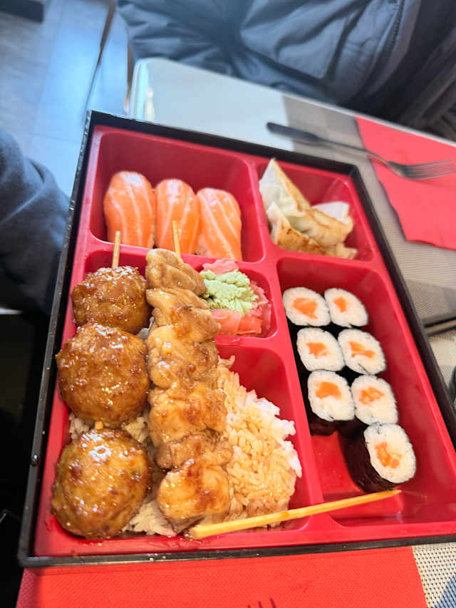 - 4 gyoza poulet, 8 maki saumon, 3 sushi saumon, 3 brochettes (1 bœuf au fromage, 1 poulet, 1 boulettes de poulet) et un riz nature