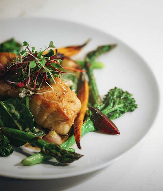 - Peixe branco grelhado, com baby legumes e beurre blanc de guanciale