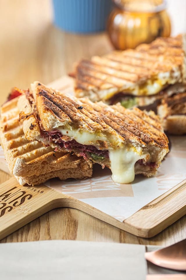 Pastrami, pepinillo, mostaza de miel y queso ahumado en pan de hogaza.