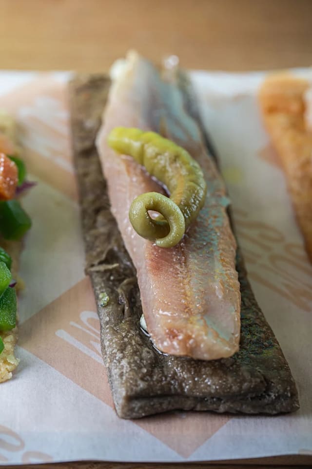 Boquerones en vinagre sobre cama de patatas fritas gourmet.