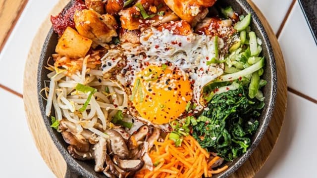 Korea’s most famous dish served on a sizzling plate. Rice, spinach, shitake, carrots, cucumber, egg. choose : pork belly, crispy chicken, salmon, veggie