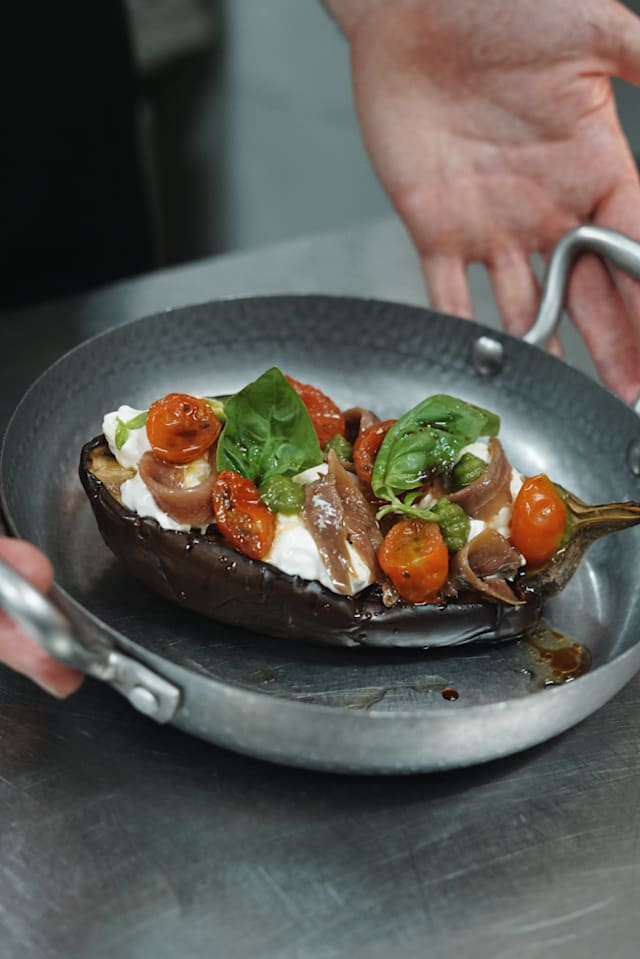 Melanzana fondente con stracciata di burrata, acciughe di cetara, pomodorini confit e gel al basilico