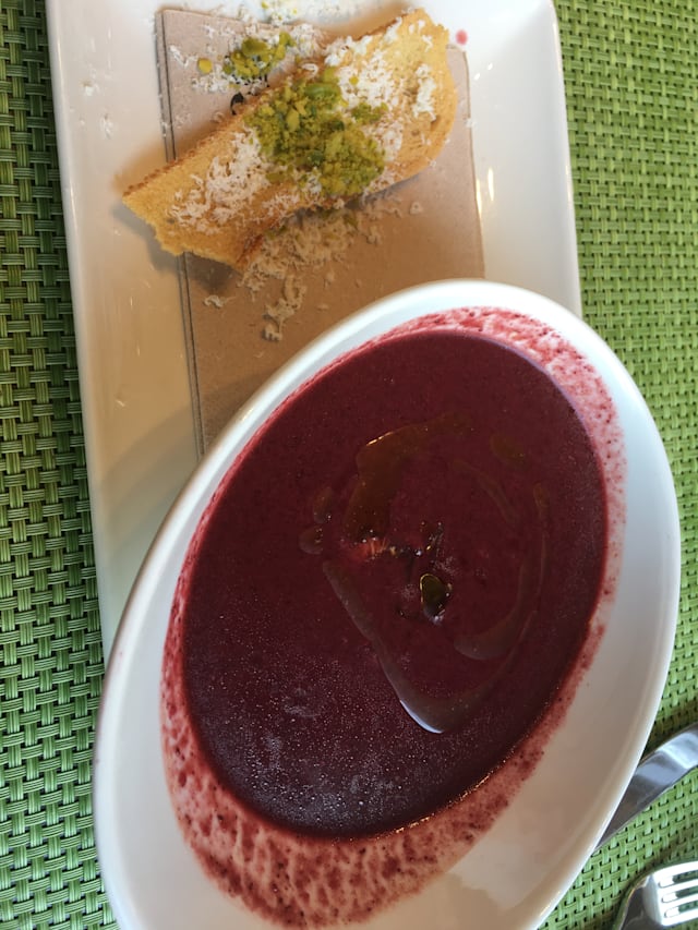 Amanida de tomàquets amb mongeta tendra, mató i remolatxa amb vinagreta de mel i mostassa