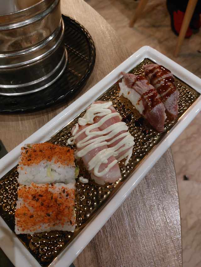 - Rollo aburi salmón con cebolla frita (4 uds)