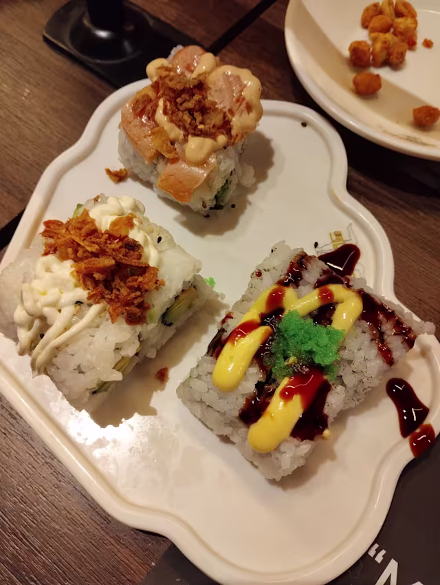 - Rollo aburi salmón con cebolla frita (4 uds)