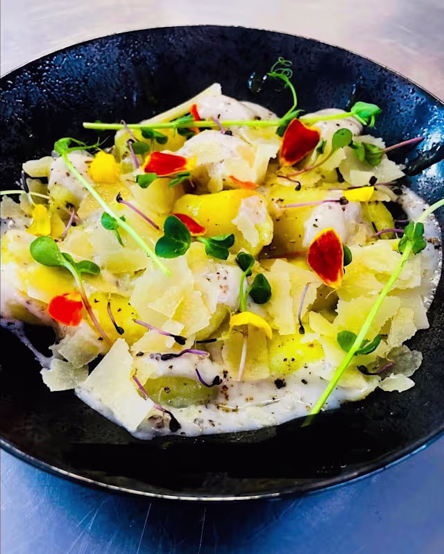 - Ravioles fondantes garnies de gambas et de homard, nappées d'une bisque maison intense et élégante.