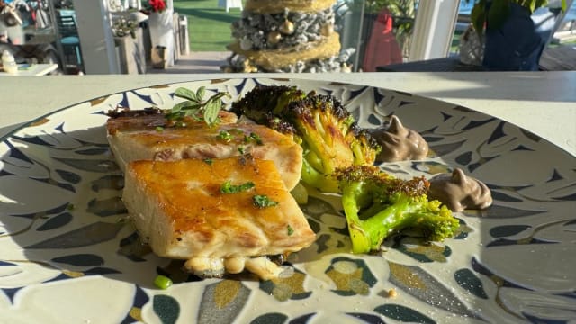 Filetto di ombrina, broccoli croccanti e maio all'aglio nero