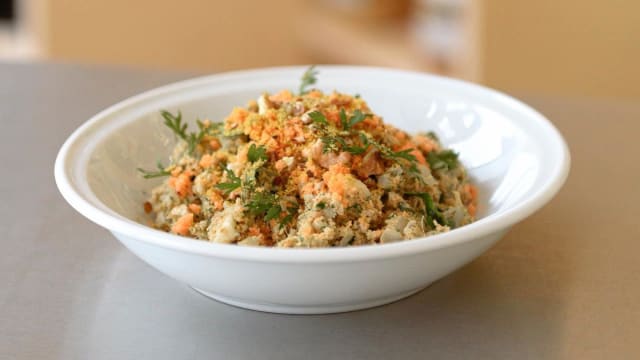 Rillettes de poireaux, pâte de noix, zeste d'agrume