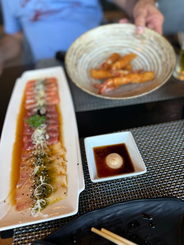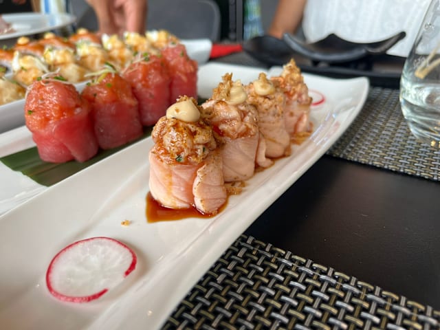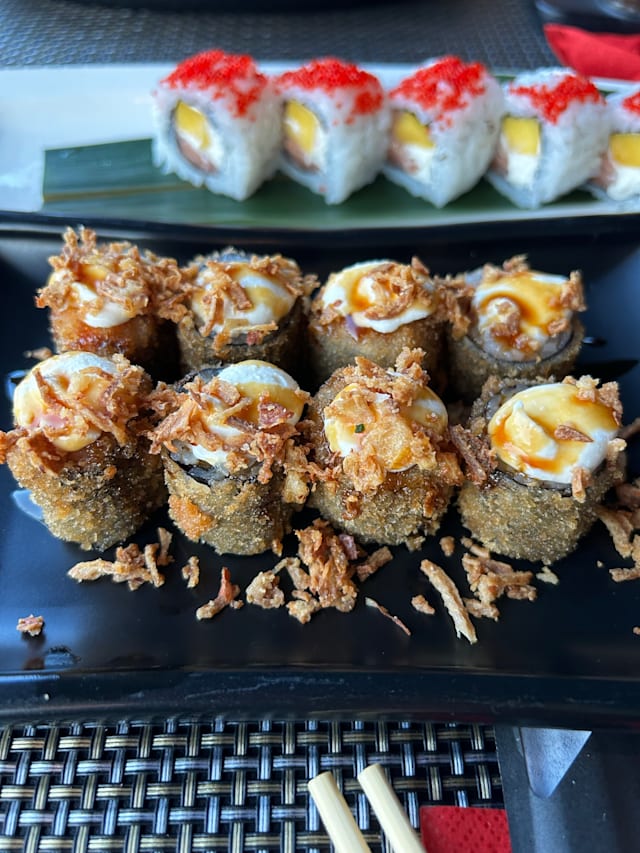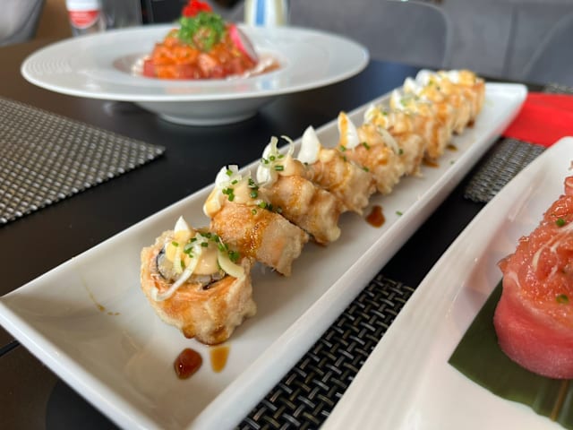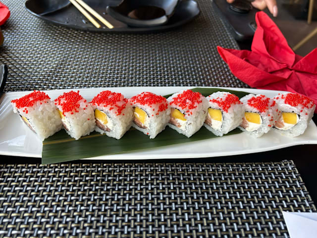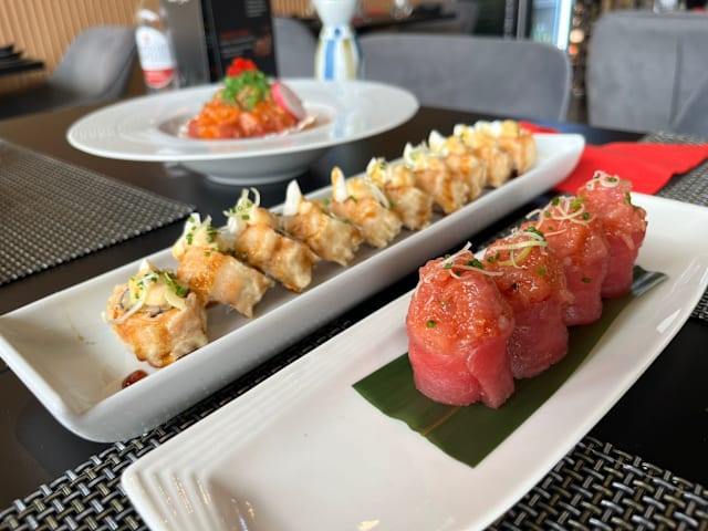 7/10Sashimi was good, though tuna sashimi arrived seared. But Salmon tartar was with mango and rice, which was not great, and the hot rolls were not as expected as well. The service was fast.