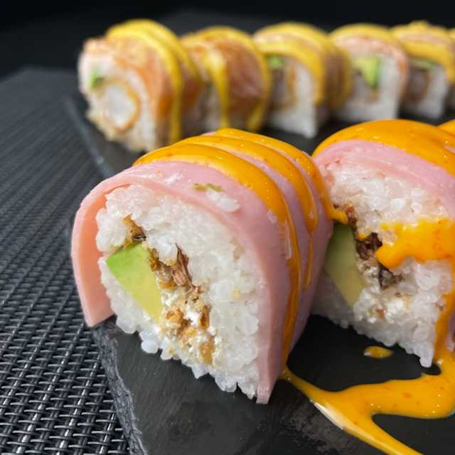 - Tempura, avocat, cheese, saumon braisé, curry mango