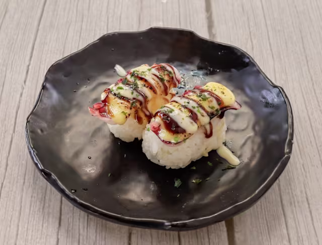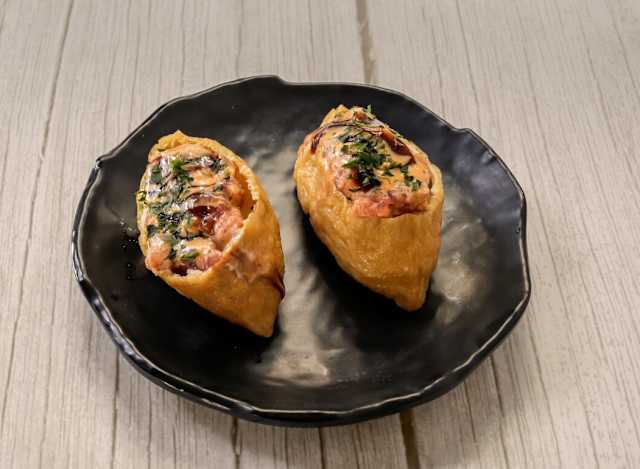 - Uramaki de atún picado (picante) relleno de queso, cebollas, rebozado, aguacate y tortilla de huevo