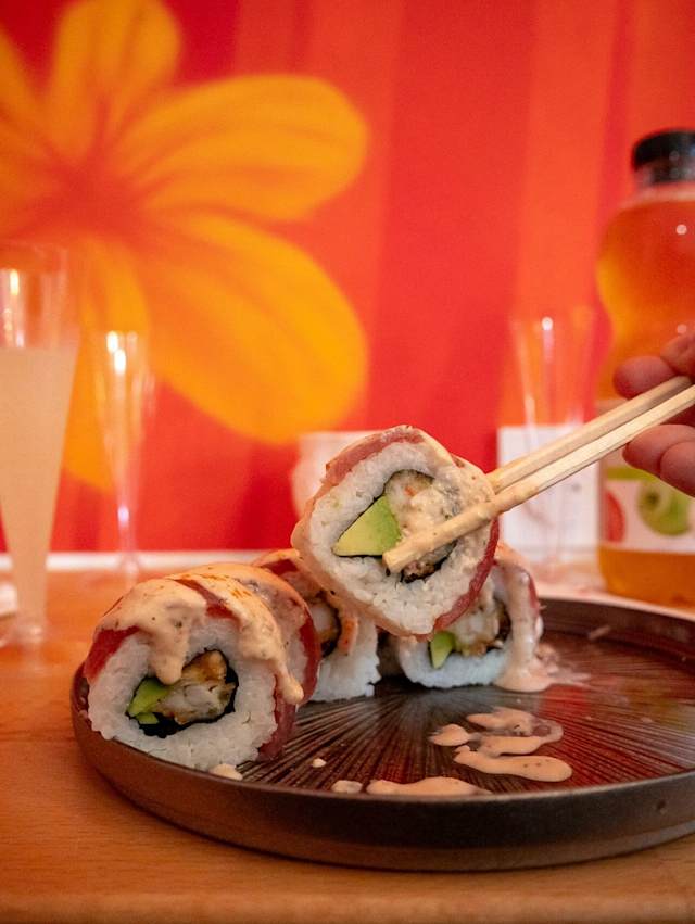 - Crevettes tempura, cheese, cébette, enroulé avec thon et avocat, sésame, ciboulette, sauce acevichada