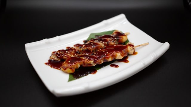 Bolas fritas relleno de pulpo con sesamo,salsa de anguila