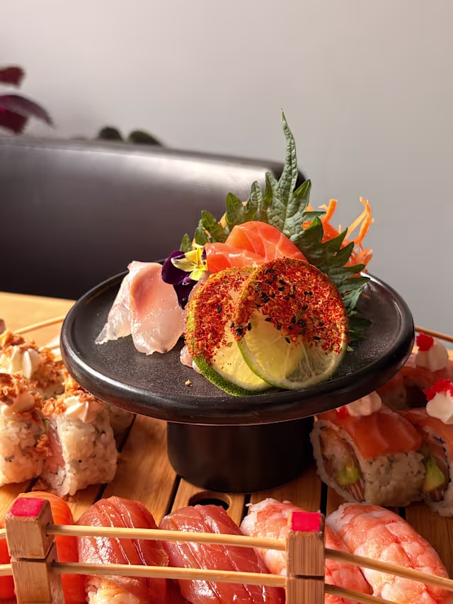 - 1 Salmon, 1 tuna, 1 dorado, 1 unagi, 1 tamago, 1 crab, 1 saba