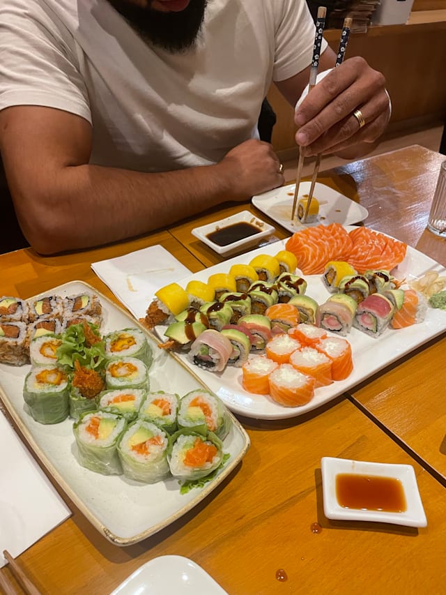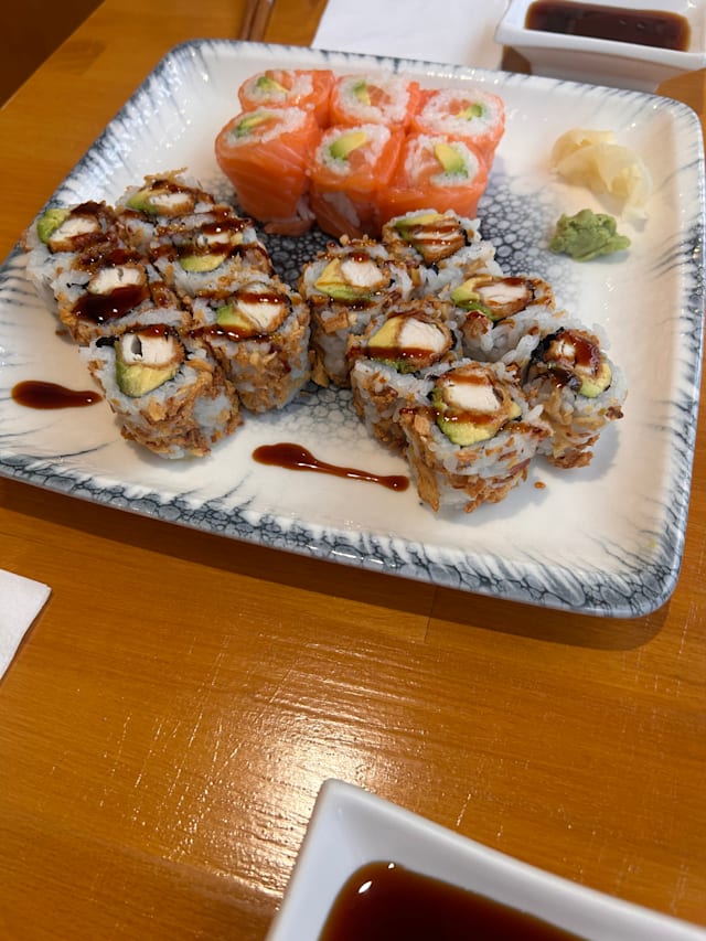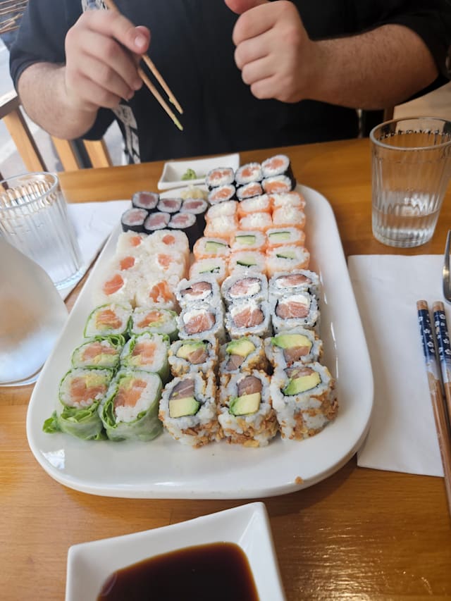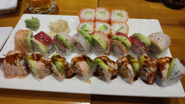 3 soupe, 3 salade, 3 riz 12 assortiment de sushi, (6 thon, 2 saumon, 2 saumon cheese, 2 avocat saumon) 6 printemps saumon avocat 6 saumon roll avocat cheese 6 california oignon avocat poulet pané 8 avocat saumon roll 8 tiger roll 6 maki avocat cheese 2 boissons ( canette 33cl au choix )