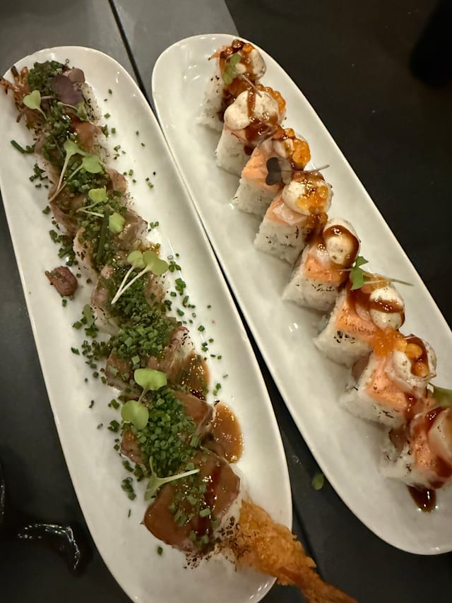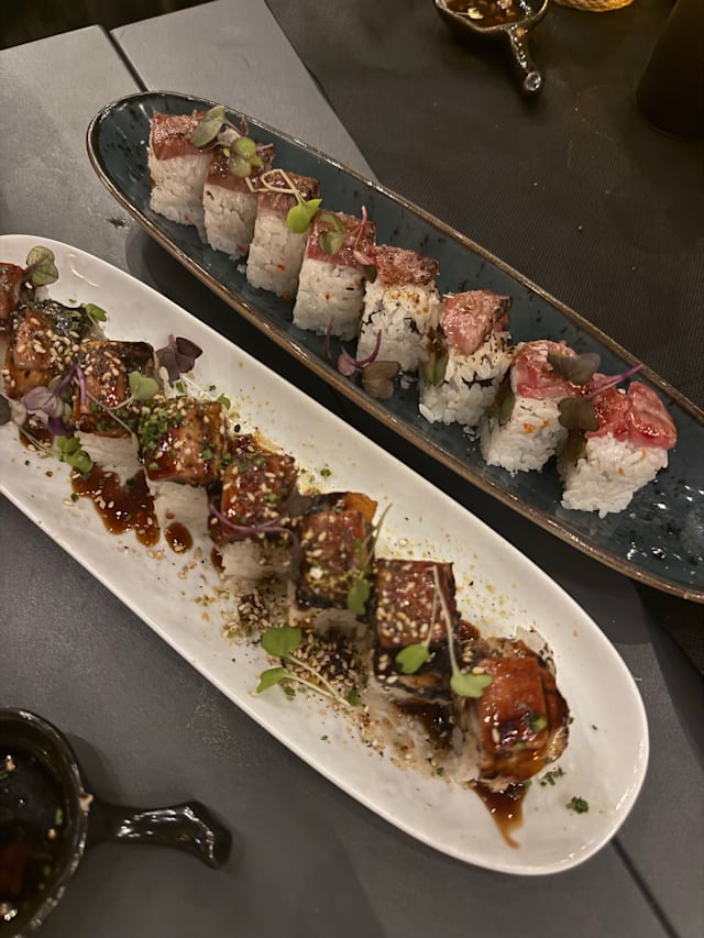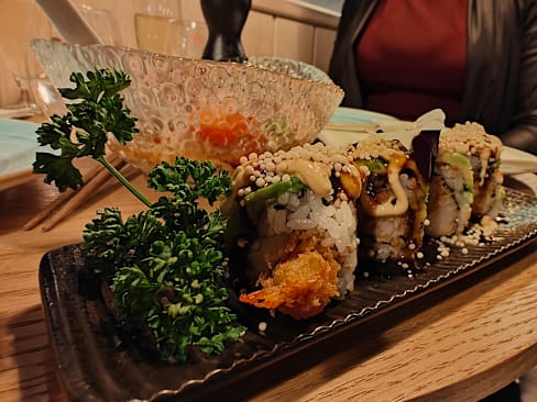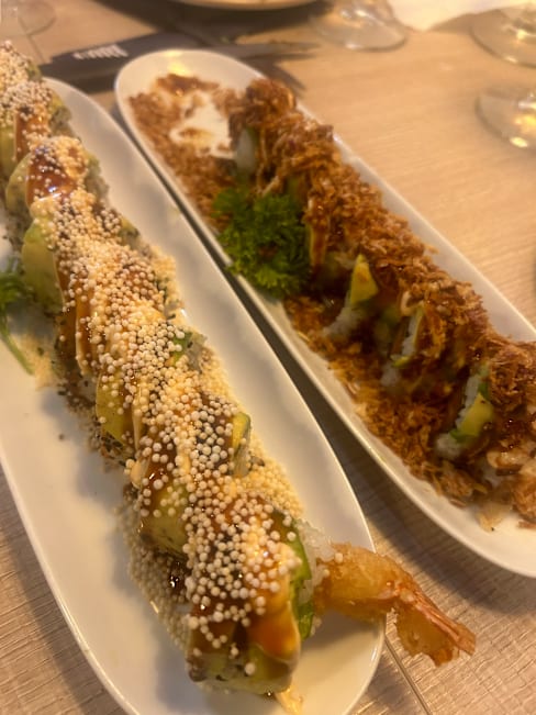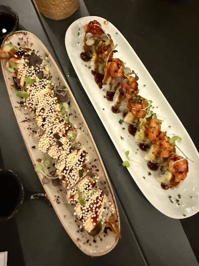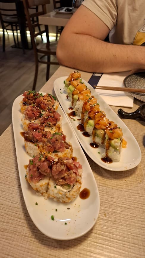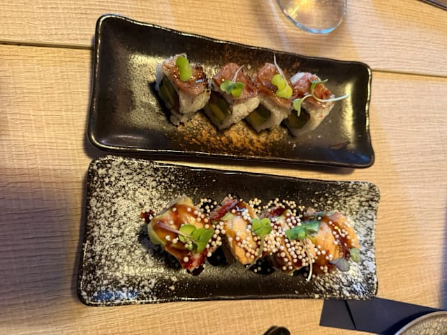 8/10Great food. Many fun and interesting sushi rolls. Not traditional. All of the food was great! Service was ok and a few servers are not very friendly or helpful. Location is by residential buildings and ambience is not great.