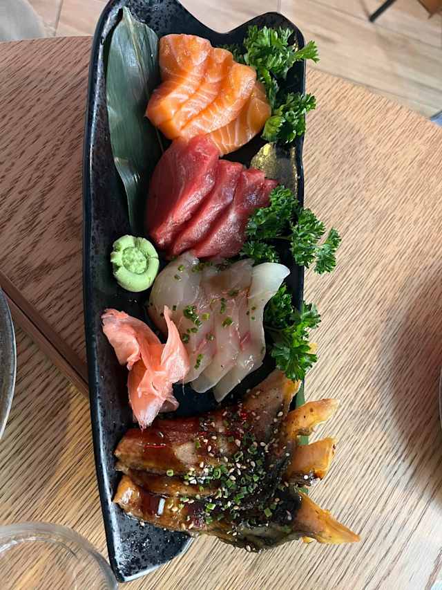 - Rollo invertido de arroz relleno de langostino tempurizado, aguacate y queso cremoso recubierto de salmón flameado, salsa siracha de coco y sishimi.