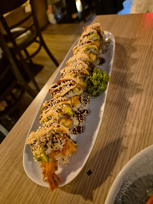 8/10Great food. Many fun and interesting sushi rolls. Not traditional. All of the food was great! Service was ok and a few servers are not very friendly or helpful. Location is by residential buildings and ambience is not great.