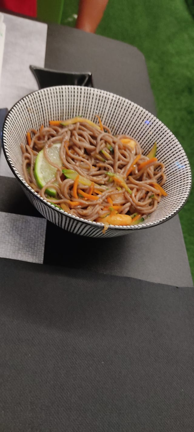Spaghetti di grano saraceno in salsa di soia con verdure spadellati al wok