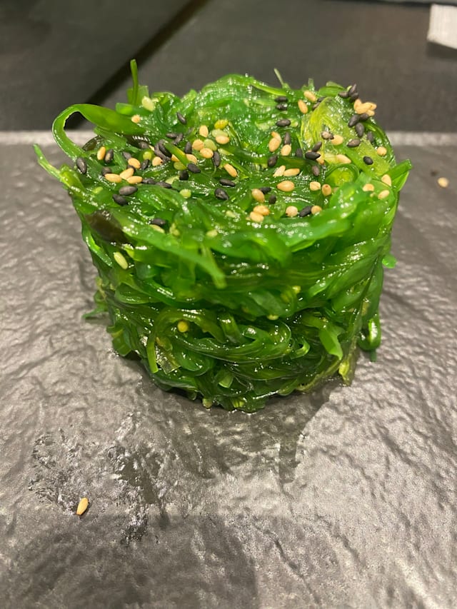 Zucchina tempura, philadelphia. sopra wakame. cipolla fritta, mayo al basilico