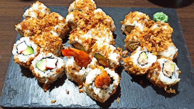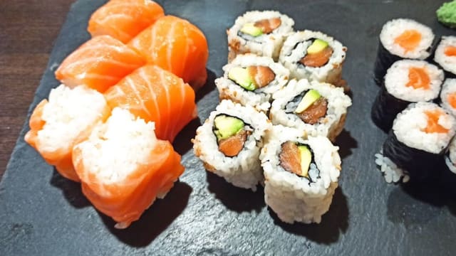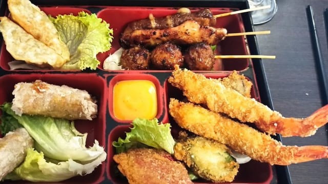 Plateau love sushi - 40 pièces (2 soupe, 2 salade, 2 riz nature)€522 sushi saumon, 2 sushi daurade 2 sushi thon, 1 sushi crevette 1 sushi poulpe, 1 sushi omelette, 1 gunkun œuf saumon, 6 maki saumon 6 thon roll saumon avocat 6 sashimi saumon 3 sashimi daurade, 3 sashimi thon 2 brochettes boulette de poulet 2 brochettes poulet 2 brochettes bœuf formage