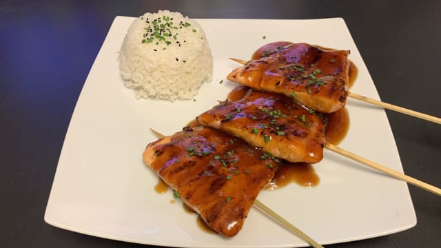 (4 brochettes de poulet grillé sauce terryaki, riz japonais)