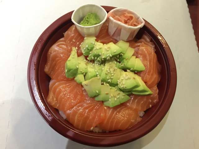 - 12 sashimi saumon avec avocat sur un bol de riz vinaigré